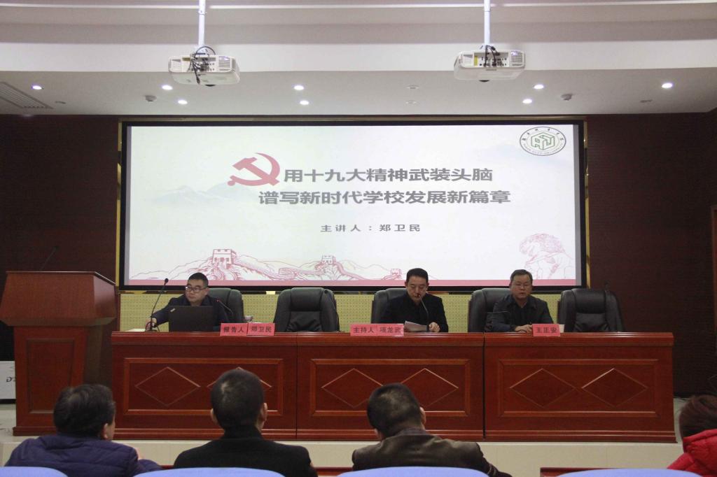 会上,郑卫民以“用党的十九大精神武装头脑,谱写新时代学校发展新篇章”为主题,从“精神要点”与“学校实践”两方面解读了党的十九大报告。郑卫民首先介绍了党的十九大报告的主题和意义,同时指出党的十九大报告是全党集体智慧的凝结,是习近平长期个人实践与思考的结果,是科学方法论指导下的产物;要准确把握好十九大报告中新成就、新判断、新思想、新部署、新使命、新要求六大精神要点。