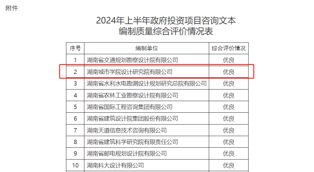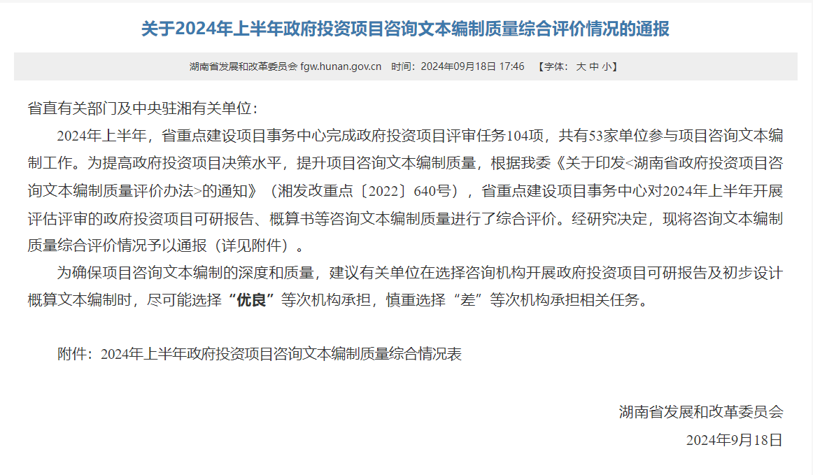 9月18日,湖南省发展和改革委员会发布《关于2024年上半年政府投资项目咨询文本编制质量综合评价情况的通报》,2024年上半年,省重点建设项目事务中心完成政府投资项目评审任务104项,共有53家单位参与项目咨询文本编制工作,省重点建设项目事务中心对2024年上半年开展评估评审的政府投资项目可研报告、概算书等咨询文本编制质量进行了综合评价。yl34511线路中心设计研究院有限公司获评优良(排名第二)。