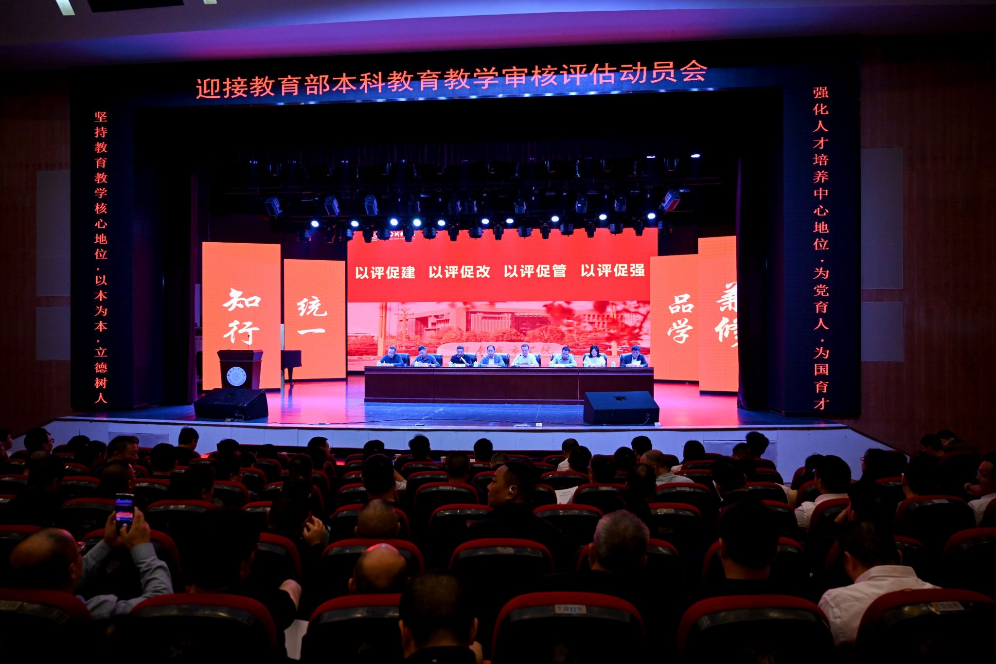 本网讯 为高质量完成本科教育教学审核评估各项工作,以最佳状态迎接教育部审核评估专家组的评估指导,10月7日下午,学校在音乐厅召开本科教育教学审核评估迎评动员会,全体校领导出席。校长何振强调,全校师生要以乘势而上的冲劲、雷厉风行的作风、求真务实的行动,戮力同心、砥砺前行,打赢这场审核评估“攻坚战”,全力以赴确保本科教育教学审核评估高水平完成。