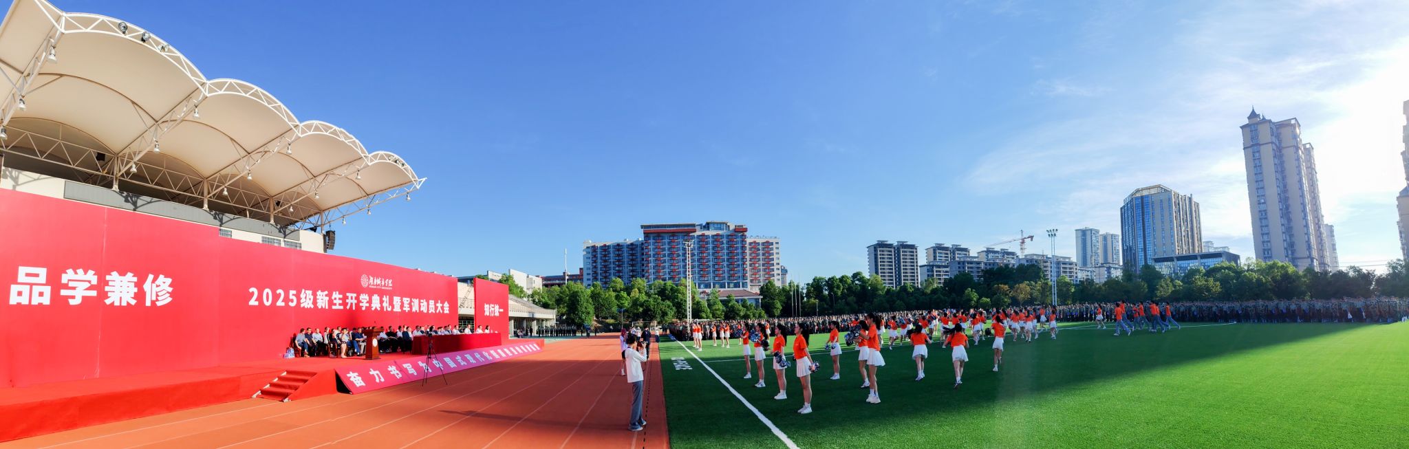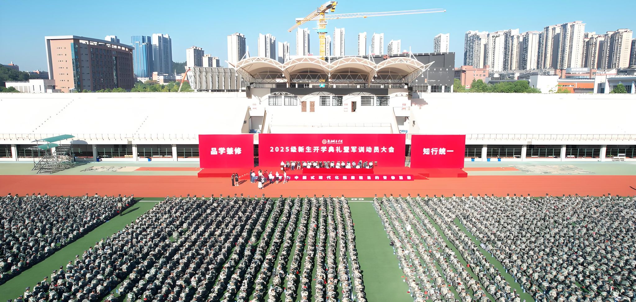 本网讯 苦尽甘来,十年寒窗终圆梦。乘风破浪,万里晴空任尔飞。9月17日上午,yl34511线路中心2025级新生开学典礼暨军训动员大会在学校东田径场举行,6900余名2025级本科生、研究生新生承载着殷切期望、怀揣着青春梦想,在城院开启人生新征程。校党委书记何振寄语2025级新生:要把“让城市生活更加美好”作为专业学习的目标和职业愿景,充分认识、尊重、顺应城市发展规律,探索智慧城市建设新领域,在未来城市的画卷上留下青春注脚。