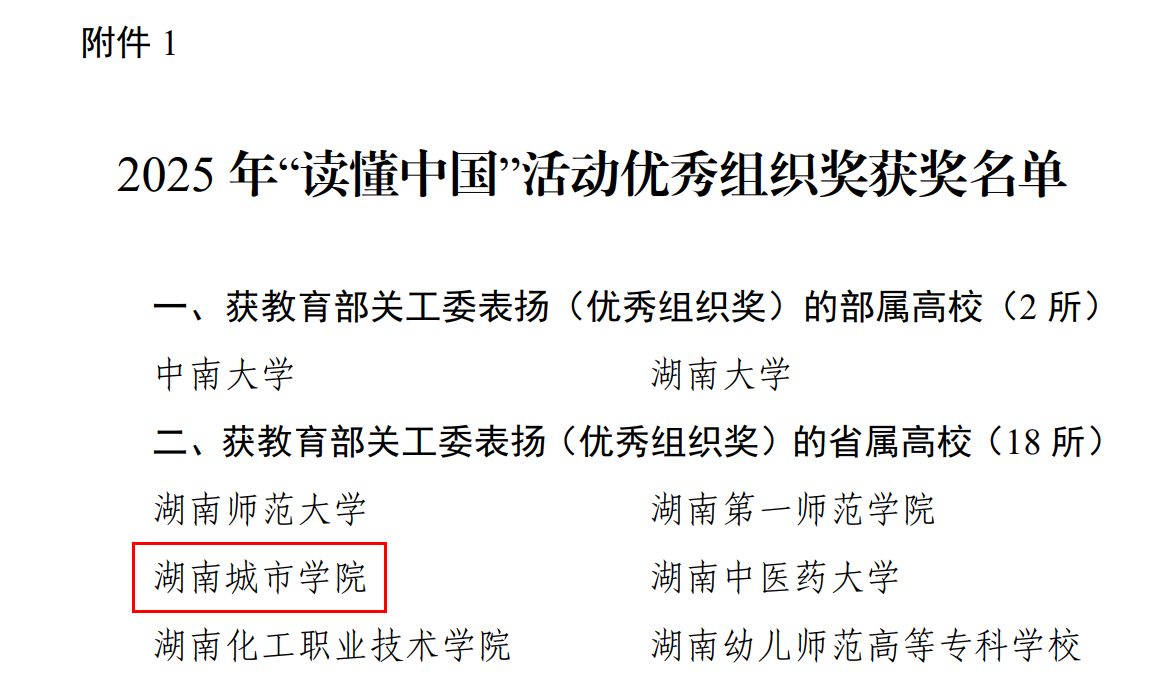 本网讯(通讯员 罗延富)近日,中共湖南省委教育工委下发《关于公布2025年全省普通高校“读懂中国”主题教育活动优秀组织奖和作品奖评审结果的通知》。永利官网荣获2025年国家教育部关工委“读懂中国”主题教育活动优秀组织奖,并获最佳微视频1个;获省教育厅关工委特等奖1项、二等奖4项、三等奖1项。