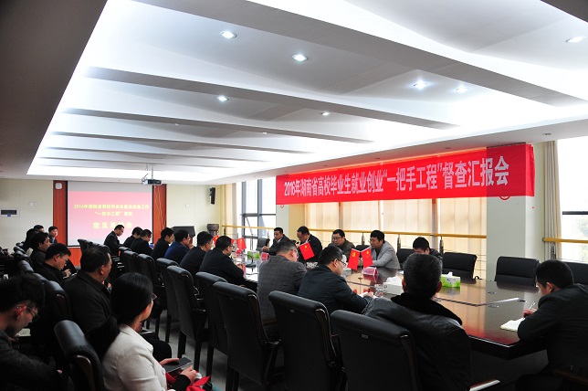 副校长汤放华就永利官网毕业生就业创业工作“一把手工程”落实情况向督查组作了汇报。他重点介绍了永利官网以建设湖南省就业创业示范校为契机,积极构建“一个目标,双轮驱动,三全服务,四课指导,五位一体精准帮扶就业”的就业创业工作新模式。