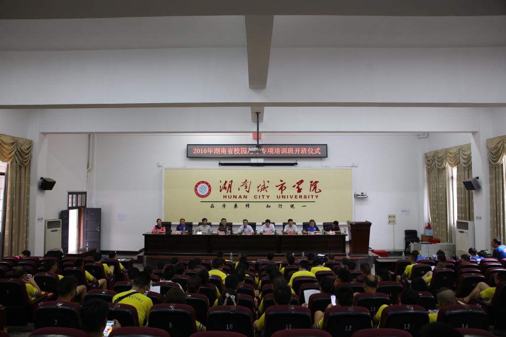 (本网讯)7月19日上午9:00,由湖南省青少年校园足球工作领导小组、省教育厅主办,永利官网承办的2016年省青少年校园足球中小学骨干体育教师培训在永利官网体育学院开班。省教育厅体卫艺处王宇、省校园足球办公室主任李泽群、益阳市教育局体卫艺科科长张伟,学校副校长雷存喜和教务处相关负责人、体育学院领导班子成员等出席了开班仪式。仪式由体育学院党总支书记熊兴吾主持。