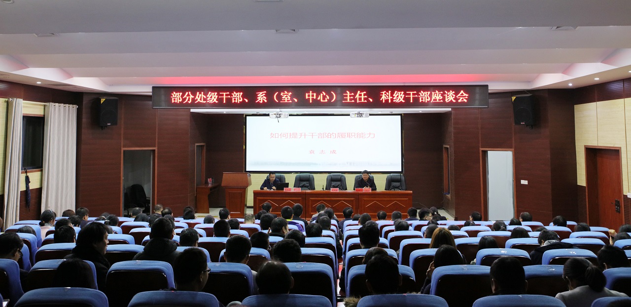 (本网讯)11月12日晚,党委组织部在建筑规划楼学术报告厅举行了45岁以下部分处级干部、系(室、中心)主任、科级干部座谈会。党委书记罗成翼就青年干部的“担当”问题,作重要讲话。会议由党委副书记汤放华主持。120余名机关处室、二级学院处级干部、系(室、中心)主任、科级干部参加会议。