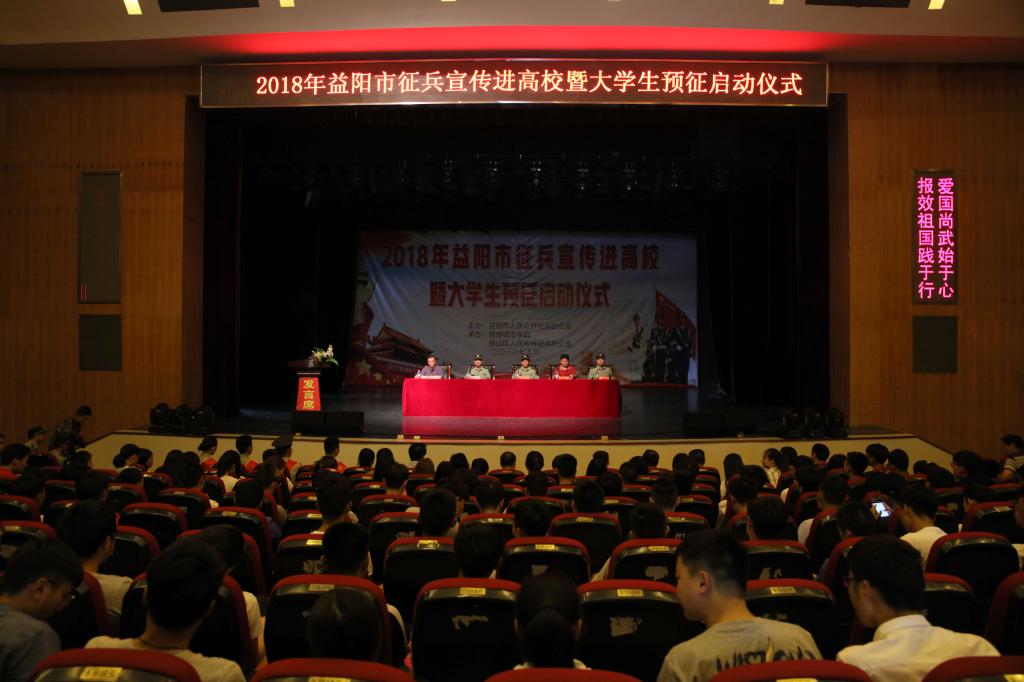 (本网讯)5月3日下午,2018年益阳市征兵宣传进高校暨大学生预征启动仪式在永利官网音乐厅隆重举行。益阳军分区政委张先旺大校,益阳市征兵办公室主任、军分区动员处处长肖尊华上校,赫山区人武部政委陈跃海,永利官网党委副书记汤放华、副校长雷存喜,各二级学院党委(党总支)副书记、赫山区人武部工作人员、征兵形象大使以及400余名师生代表出席了启动仪式。仪式由雷存喜主持。