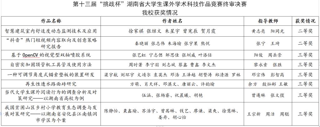 (本网讯)2019年5月31日至6月2日,由共青团湖南省委、湖南省教育厅、湖南省科技学术协会、湖南省社会科学院、湖南省学生联合会联合举办的第十三届“挑战杯”湖南省大学生课外学术科技作品竞赛终审决赛在中南林业科技大学举行。永利官网共8件作品进入终审决赛,经过与全省36所高校(277件作品)的激烈竞争,获得了二等奖2项、三等奖6项的优异成绩,其中《智慧建筑室内舒适度动态监测技术及应用》及《“抖音”热门短视频内容取向及创意策略研究报告》获得“挑战杯”国赛资格。