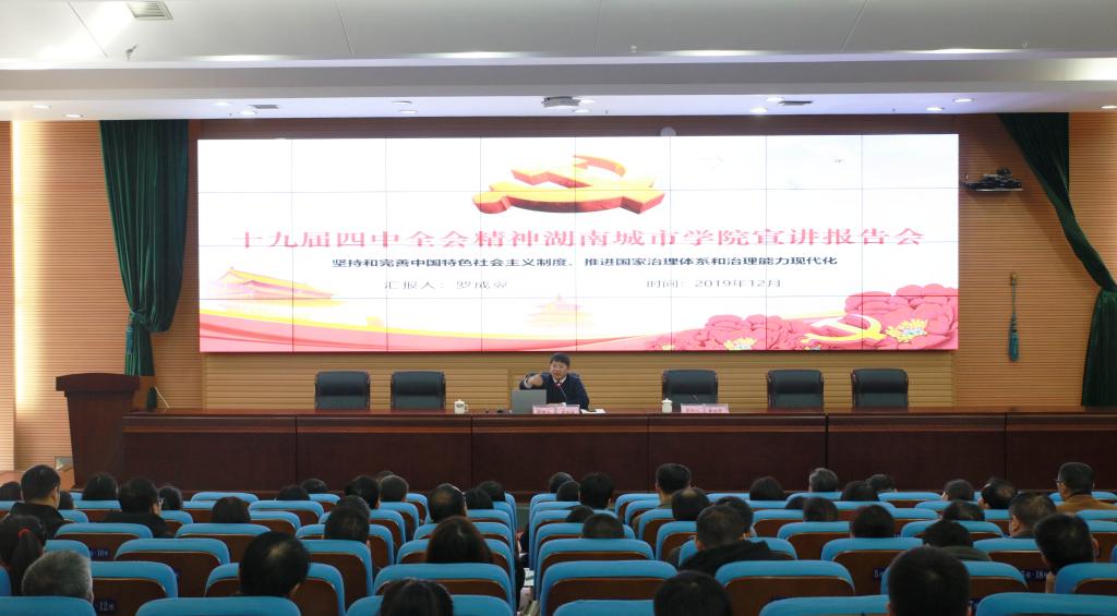 (本网讯)为深入学习宣讲《中共中央关于坚持和完善中国特色社会主义制度,推进国家治理体系和治理能力现代化若干重大问题的决定》(以下简称《决定》),深刻领会贯彻党的十九届四中全会精神,确保党和国家的重大决策部署按制度要求落到实处、见到实效,按照省委、省委教育工委部署要求,yl34511线路中心于12月4日上午在学校图书馆报告厅举行党的十九届四中全会精神宣讲报告会。党委书记罗成翼作宣讲报告。学校在家校领导,各二级党组织书记、副书记,机关党员,全体辅导员参加报告会。党委副书记、校长李建奇主持报告会。