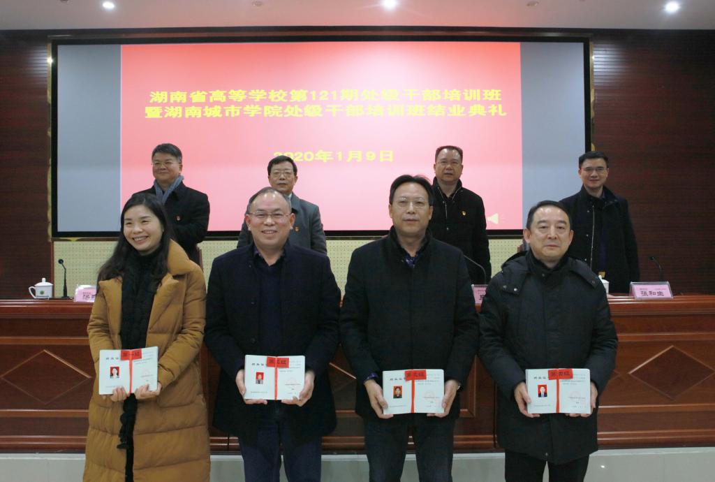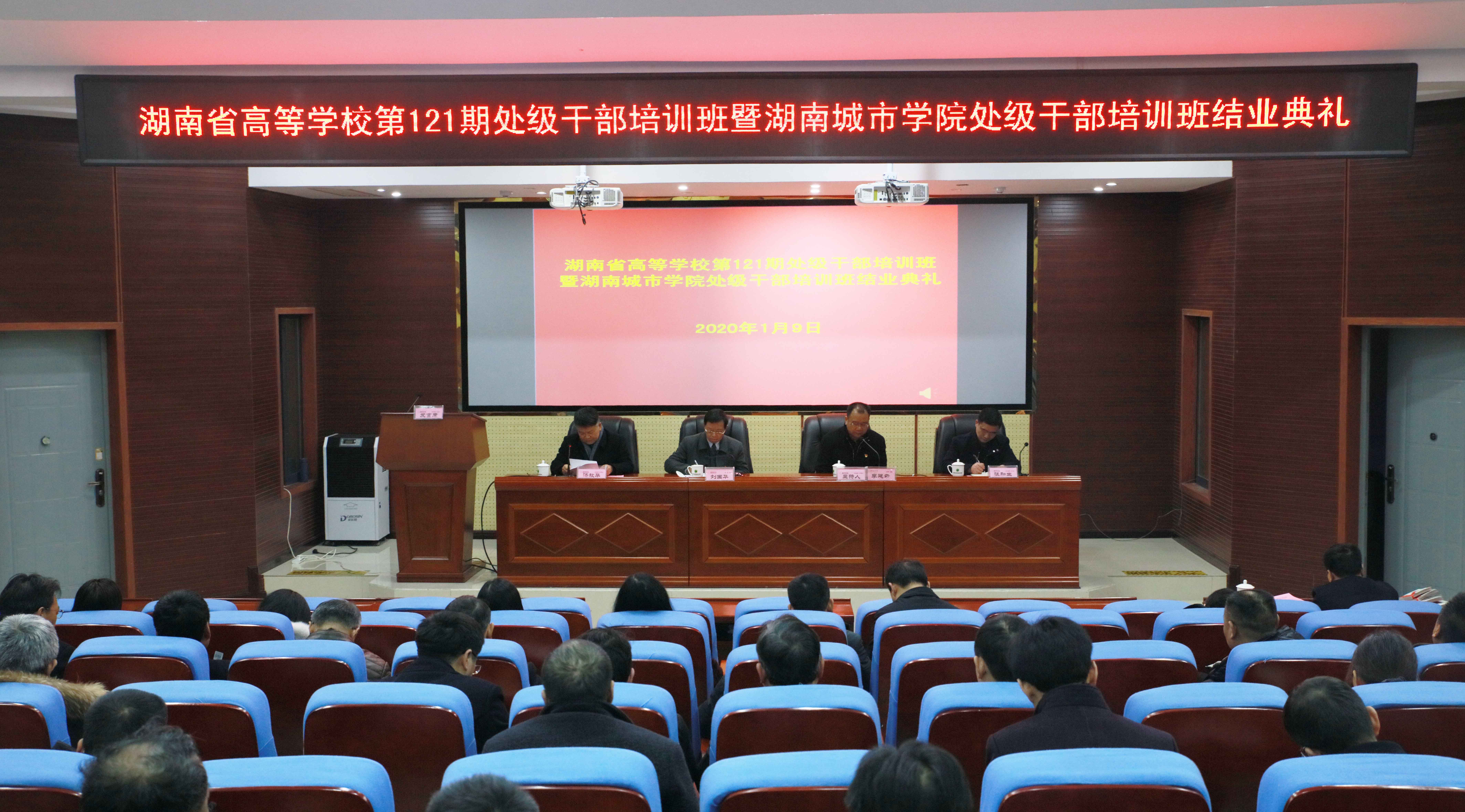 (本网讯)2019年1月9日,湖南省高等学校第121期处级干部培训班暨yl34511线路中心处级干部培训班结业典礼在永利官网图书馆报告厅举行。湖南省高校干部培训中心主任、书记,省委教育工委党校常务副校长刘国华,省高校干部培训中心副主任张和生,党委副书记汤放华,党委委员、组织部长袁志成出席。结业典礼由党委副书记、校长李建奇主持。
