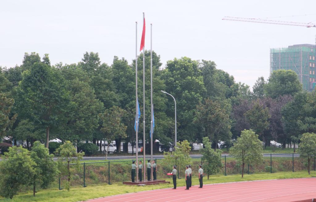 7点整,学校国旗护卫队旗手们着装整齐、护着鲜艳的国旗、迈着矫健的步伐走向升旗台。伴随着激昂雄壮的国歌声,五星红旗冉冉升起、迎风飘扬,全体师生齐唱国歌、行注目礼,向伟大的祖国致敬,向无数“平凡”英雄致敬。庄严的升国旗仪式后,进行了奏校歌、升校旗的环节。