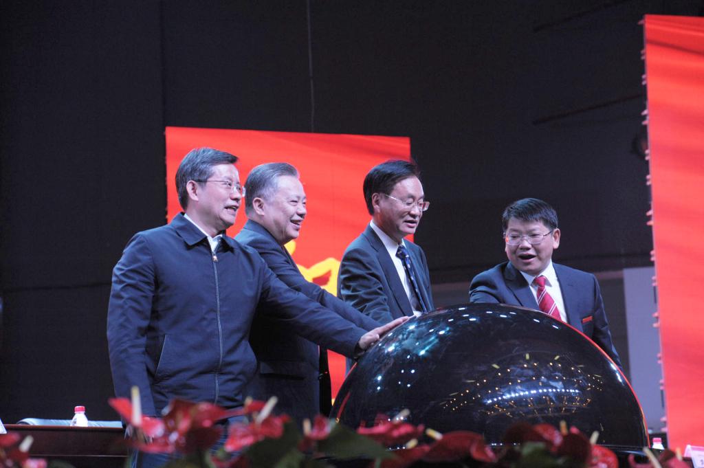 唐之享、李友志、瞿海、罗成翼共同启动水晶球,标志yl34511线路中心纪念办学50周系列活动启动。