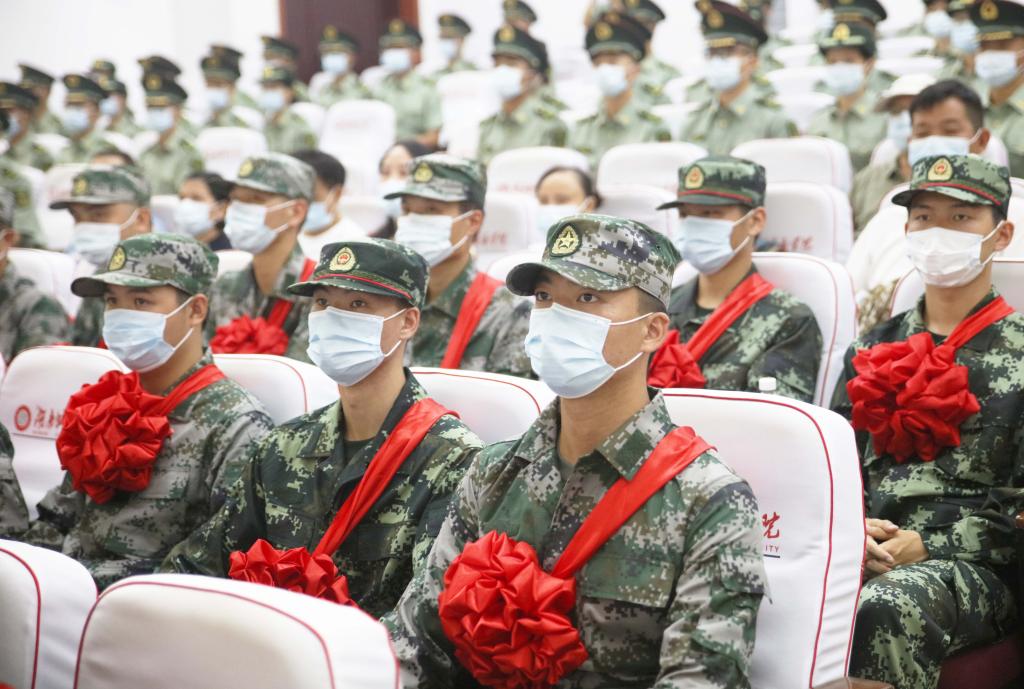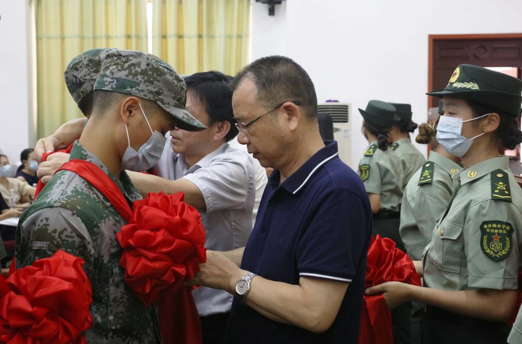 会上,学校武装部负责人宣读了应征入伍大学生名单。2021年是国家实行“两征两退”征兵政策的第一年,在学校深入宣传发动下,学生征兵入伍积极性空前高涨,报名总人数达739名。经过严格的体检、政审以及役前训练等程序,最终有来自12个学院的30名学生批准入伍,超额完成征兵任务。退伍学生代表吴有健回忆了他服役期间的难忘经历,告诉即将服役的学弟们,在部队里要坚守自己的岗位,对祖国、对人民负责。与会领导为应征入伍的大学生佩戴了大红花。