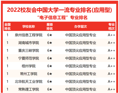 本网讯(通讯员 蒋冬初 肖卫初 李稳国)2022年3月30日,全国第三方大学评价机构艾瑞深校友会网发布校友会2022中国大学一流专业排名、2022中国大学各专业类一流专业排名。榜单显示,永利官网电子信息工程专业在2022中国大学电子信息工程专业排名(应用型)中位居榜首。