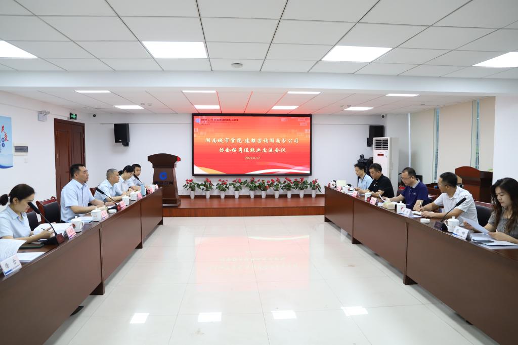 建银工程咨询湖南分公司副总经理汤国保、张丽芳,市场开发部、综合管理部、造价咨询部等负责人,学校党政办、招生就业处、美术与设计学院相关负责人参加洽谈。