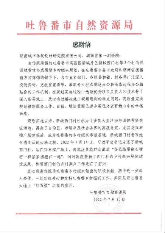 吐鲁番市自然资源局对永利官网的感谢信。