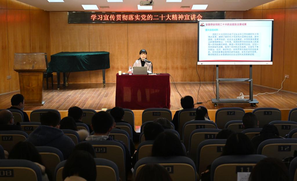 本网讯(通讯员 饶迎)12月8日下午,学校党委副书记何旭娟在学校音乐楼206无源音乐厅宣讲党的二十大精神。学校党委宣传部、市政与测绘工程学院、音乐与舞蹈学院教师和学生党员代表共140余人参加宣讲会。