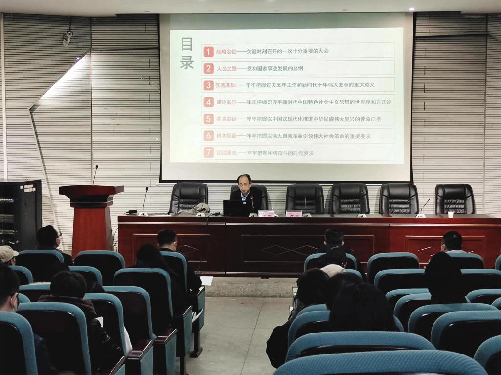 何振以“全面建设社会主义现代化国家新征程的政治宣言和行动纲领”为题,从战略定位、大会主题、基本路径等七个方面对党的二十大报告进行了全面深入的阐述。他强调,管理学院广大党员干部要牢牢把握以中国式现代化推进中华民族伟大复兴的使命任务,深刻把握“两个确立”,增强“四个意识”、坚定“四个自信”、做到“两个维护”,认真学习、深刻领会党的二十大精神并贯彻落实到具体工作之中,为全面建设湖南城市大学而努力奋斗。