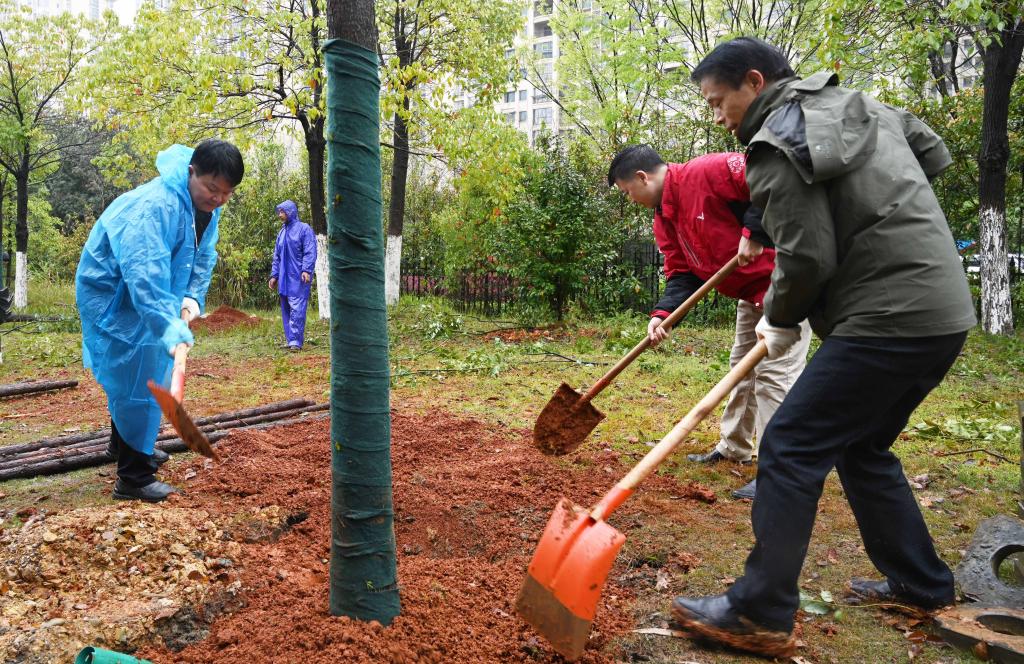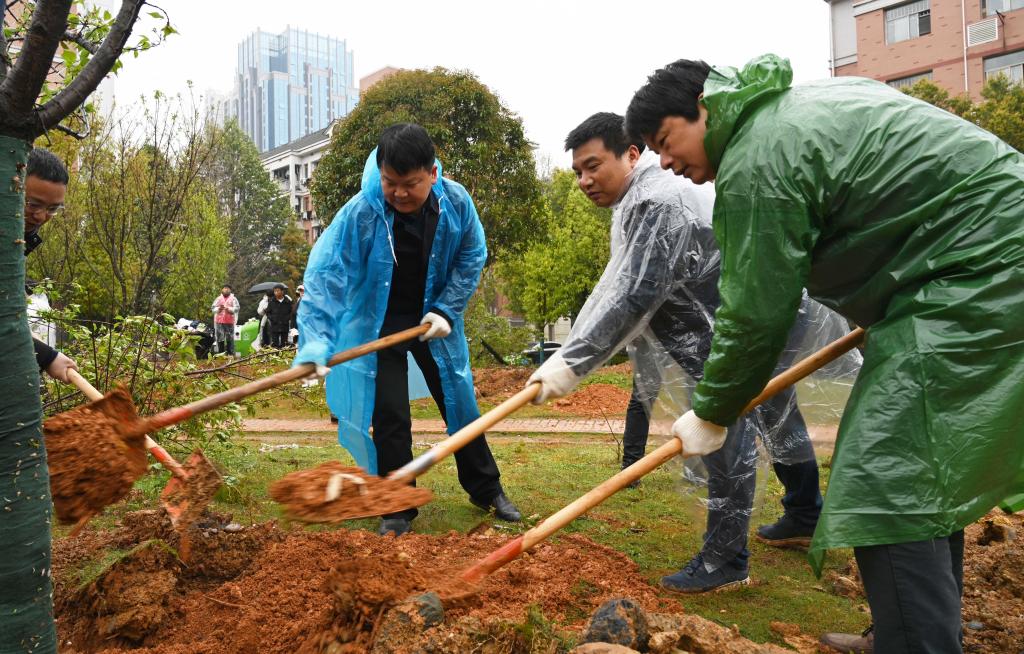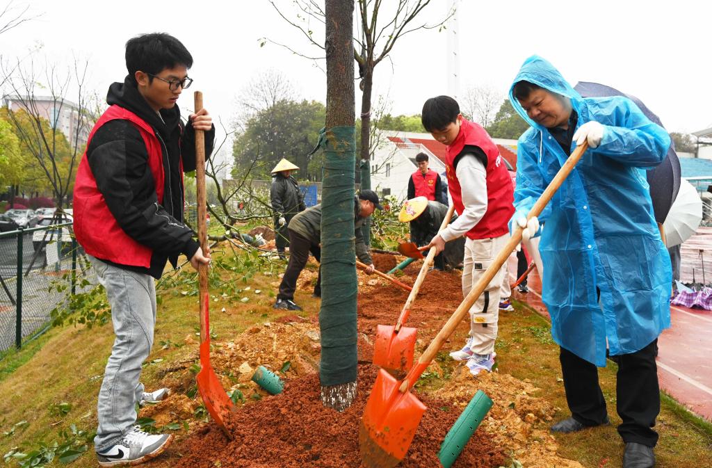 植树现场,大家相互配合,挥锹铲土、培土固苗、提水浇灌……个个笑意盎然,干劲十足,全然不顾鞋底和裤腿上沾满的湿泥土,合力栽下一株株树木。经过近3个小时的紧张劳作,一百多棵香樟树和樱花树傲然矗立在学校的每个角落,成为校园又一道美丽的风景线。
