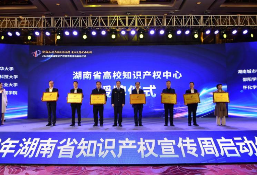 本网讯(供稿:科研处)4月23日上午,由湖南省市场监督管理局、湖南省知识产权局主办的2023年湖南省知识产权宣传周启动仪式在长沙举行。省市场监督管理局、省知识产权局局长钱俊君致辞,并就相关工作作了部署,副省长蒋涤非宣布湖南省知识产权活动周正式启动。会上专门举行了高校知识产权中心授牌仪式,校长何振代表yl34511线路中心接受授牌。