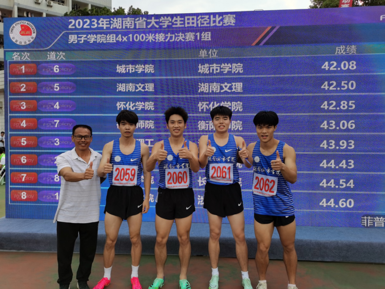 本网讯(通讯员 郭羽)2023年10月22日—10月26日,由湖南省教育厅举办的2023年湖南省大学生田径比赛在湖南科技大学举行。比赛中,永利官网运动员不畏强手,顽强拼搏,一举夺得4金6银2铜,男女团体总分学院组第五名的优异成绩,其中男子4X100米接力是永利官网升本以来首次获得这一项目的冠军。