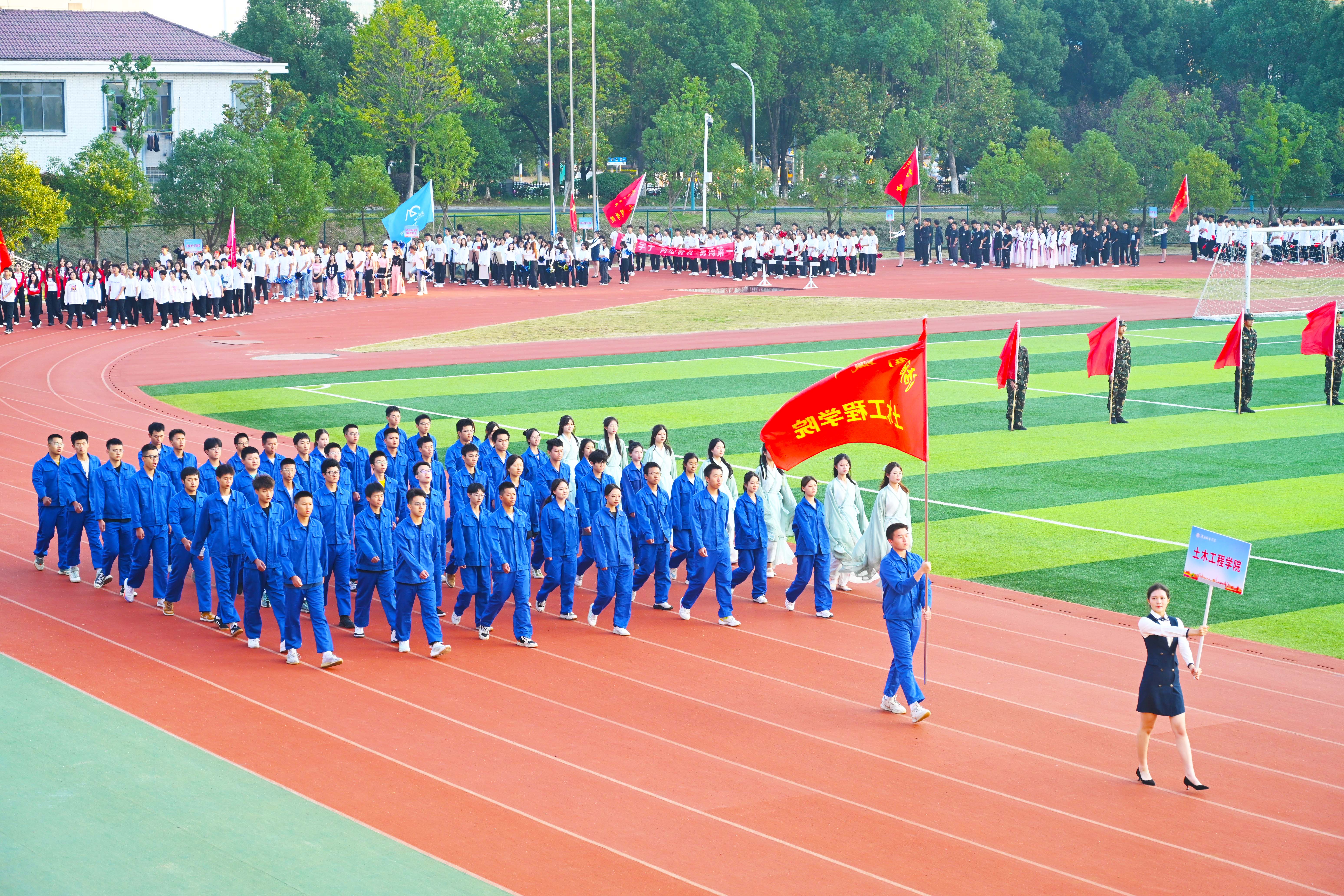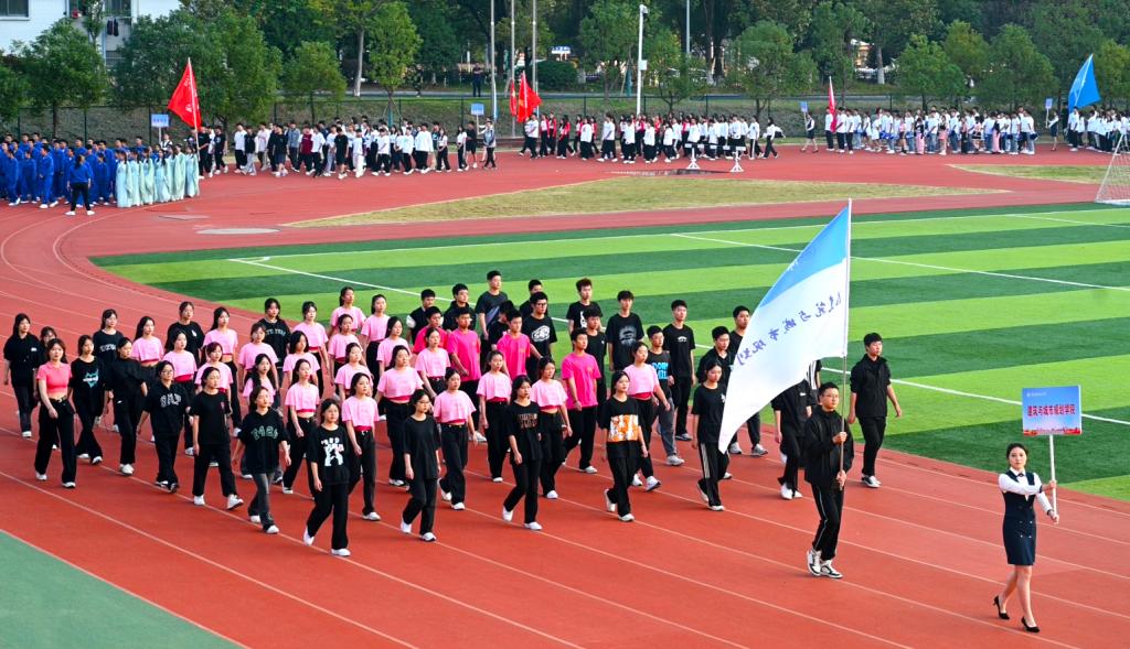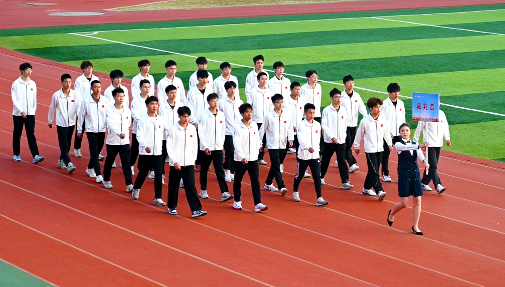 伴随着激昂的进行曲,英姿飒爽的护旗手高举国旗、校旗率先入场,校训方阵、教导队方阵、裁判员方阵、志愿者方阵、各二级学院运动员代表方阵紧随其后,依次入场,他们气宇轩昂、精神抖擞,迈着铿锵有力的步伐,阔步走向主席台,展现出城院学子们开拓创新、勇往直前的精神风貌。