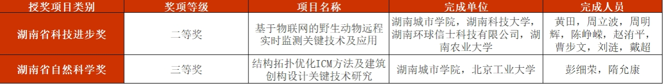 其中,永利官网信息与电子工程学院黄田副教授主持完成的“基于物联网的野生动物远程实时监测关键技术及应用”项目获湖南省科技进步奖二等奖,土木工程学院彭细荣教授主持完成的“结构拓扑优化ICM方法及建筑创构设计关键技术研究”项目获湖南省自然科学奖三等奖。