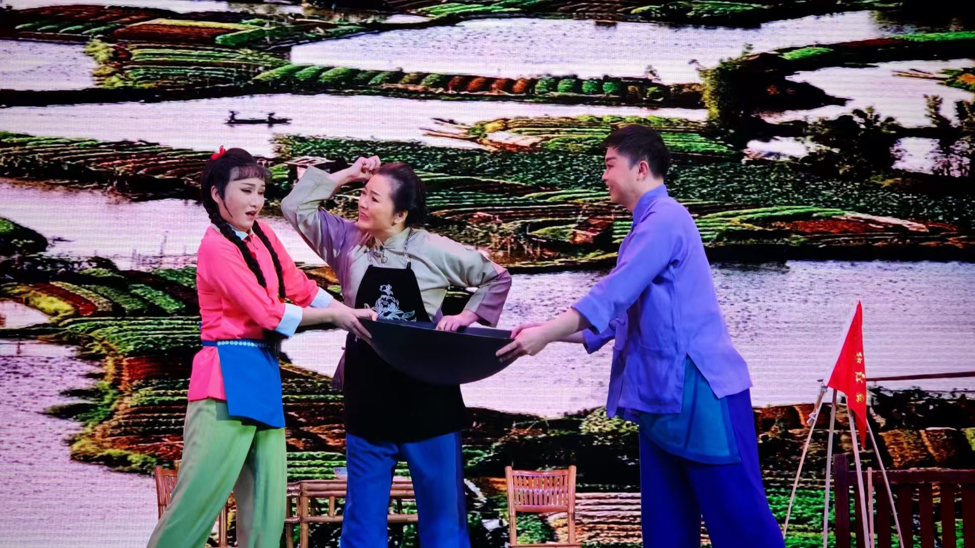 由优秀青年演员刘涛和李枝阳带来的《送表妹》。德姑娘活泼俏皮,田伢子直率木讷,二人载歌载舞妙趣横生。德姑娘的主动示好与田伢子的懵懂憨态,他们生动鲜活的人物塑造,引得台下阵阵欢笑与喝彩。
