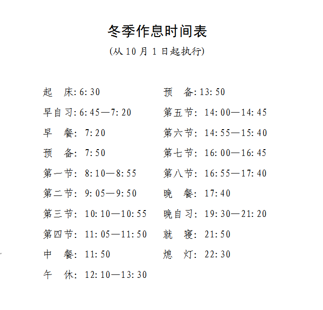10月1日起,学校执行冬季作息时间,部分教学楼栋作息时间另行通知