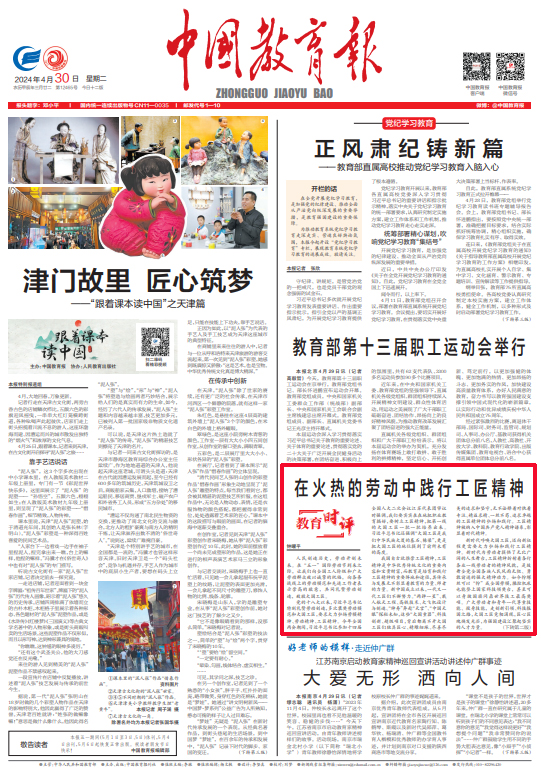 本网讯 4月30日,《中国教育报》头版发表永利官网党委副书记袁志成的评论员文章《在火热的劳动中践行工匠精神》。全文如下:
