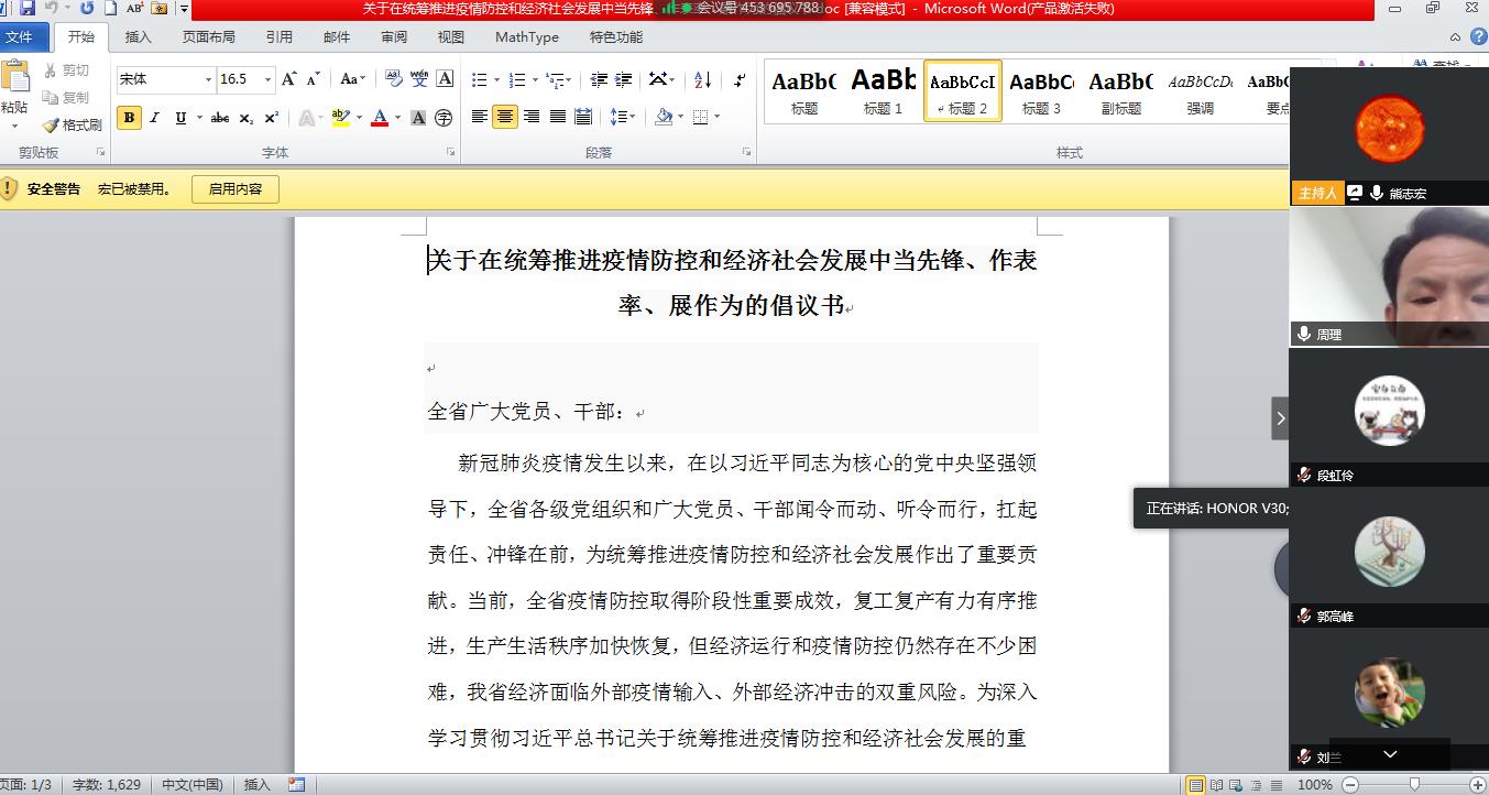 首先由支部书记周理同志领学了《学习“关于在统筹推进疫情防控和经济社会发展中当先锋、作表率、展作为的倡议书”》的文件精神,学习了中共湖南省委组织部关于在落实常态化疫情防控举措和全面推进复工复产的六条建议;然后由组织委员段虹伶同志带领大家一起学习了《深入学习习近平总书记关于统筹推进疫情防控和经济社会发展的重要讲话精神》的部分内容;宣传委员熊志宏同志带领大家一起学习了《yl34511线路中心党员教育管理办法》。学习完三个文件精神后,支部的党员同志开展了热烈的网上讨论。
