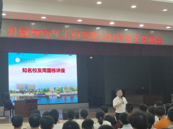 学院党委副书记易志明发表致辞,对优秀校友周国栋的到来表示热烈欢迎。他表示,大学是人生的重要阶段,每一位新生都应以长远的眼光规划未来。易志明书记的讲话为本次讲座定下了启发与鼓励的基调。