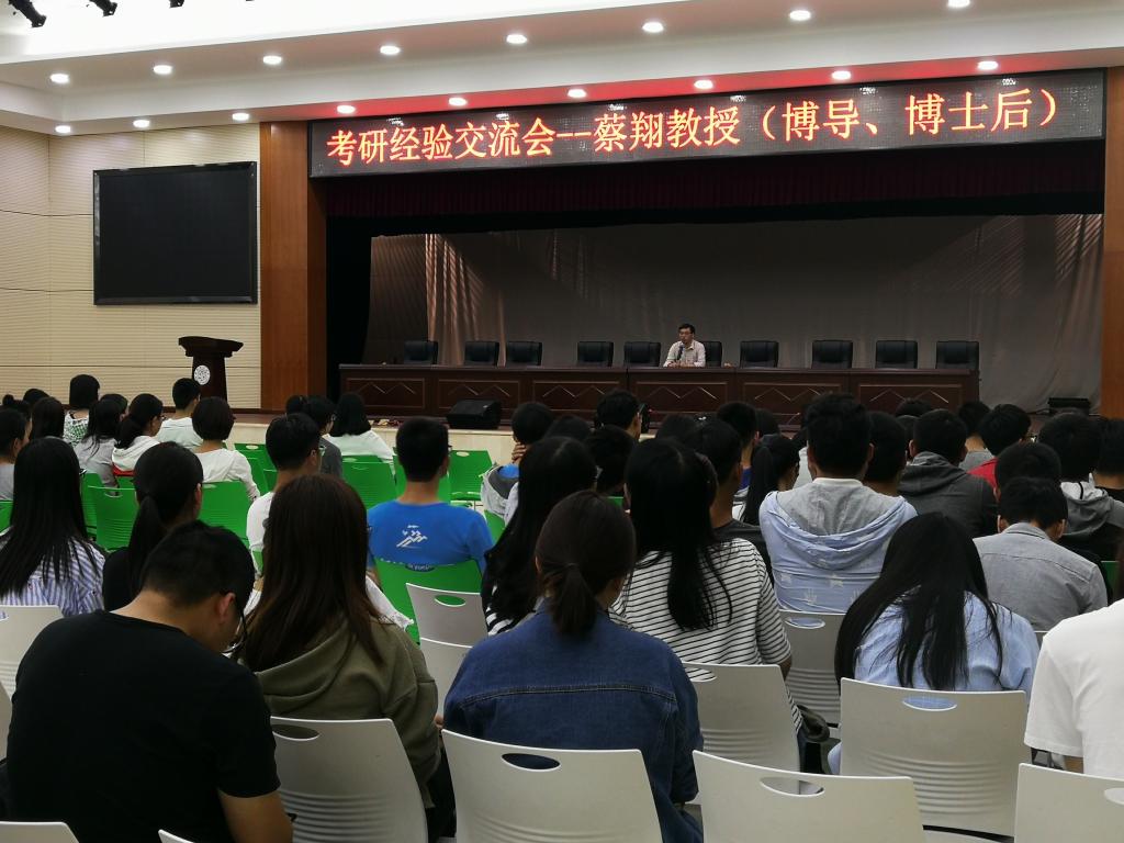 交流会首先由管理学院党委副书记贺望林进行了开场介绍,以及本次交流会的基本流程,在就管理学院当前的就业与考研现状进行简单通报后,隆重介绍了本次交流会的主讲嘉宾:来自桂林电子科技大学的博士生导师蔡翔教授。