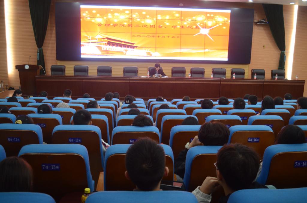 上一届学生会副书记李恒峰向大会做了工作报告,从“学风建设,基层党建建设、学生活动”三个方面总结了管理学院第二届学生委员会的主要工作和成绩。新一届学生会副书记罗荣威向大会报告了未来工作设想与举措,提出了新一届学生会将从“加强思想引领、狠抓学风建设、丰富“第二课堂””三个方面努力,不断提升团学组织自我管理、自我教育、自我服务的能力。