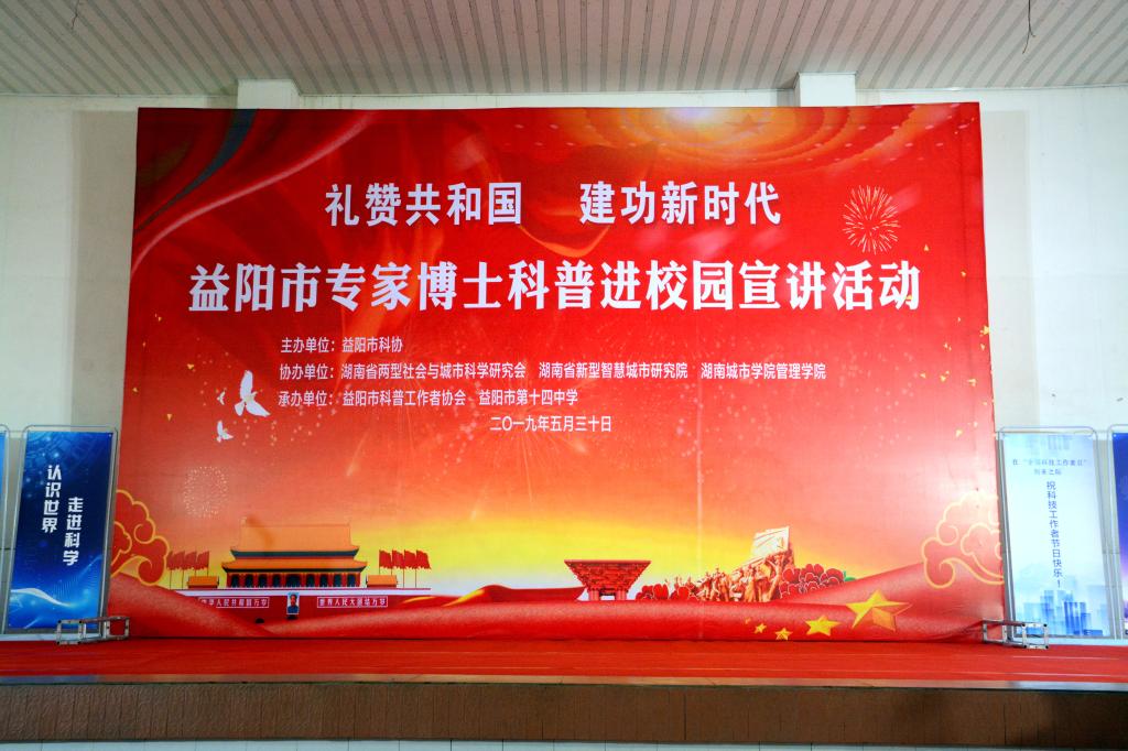 2019年5月30日,益阳市专家博士科普进校园活动在益阳市第十四中学举行。此次活动由益阳市科协主办、yl34511线路中心管理学院、湖南省两型社会与城市科学研究会、新型智慧城市研究院协办。管理学院院长孙倩、管理学院书记、省两型社会与城市科学研究会秘书长徐习军、信息与电子工程学院院长阳王东以及博士代表杜林远、刘洋、阳俊老师一行参加活动,益阳市人大常委会副主任刘时贵、益阳市科协党组副书记、副主席胡旗等市、区相关领导出席。