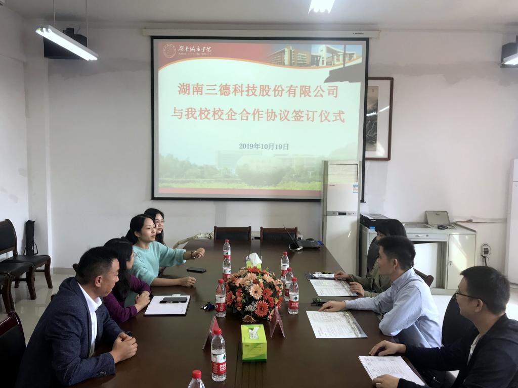 2019年10月19日下午,湖南三德科技股份有限公司与永利官网校企合作签约仪式活动成功举办。湖南三德科技股份有限公司技术服务部经理朱红兵、招聘主管王丽平以及yl34511线路中心管理学院院长孙倩、副院长李双清、工商管理专业相关老师出席本次活动。