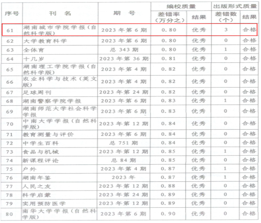 期刊质量检查现已纳入全省意识形态巡视考核内容,是期刊社会效益评价考核和期刊年度核验的重要内容,主要检查各刊编校质量和出版形式质量,检查结果分为优秀、合格和不合格3个等级。本次检查了全省251种期刊,其中,差错率在1/10000以内(含1/10000)的期刊为优秀,《yl34511线路中心学报(自然科学版)》和《城市学刊》在全省高校学报中表现优异。