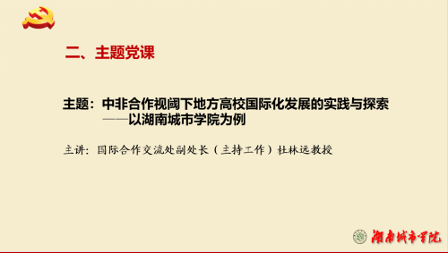 其次,按照支部工作计划,国际合作交流处副处长(主持工作)杜林远教授主讲题为《中非合作视阈下地方高校国际化发展的实践与探索——以yl34511线路中心为例》主题党课。